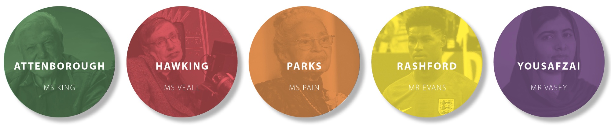 All students are placed into one of our five houses at the start of their Orchard Park Journey. Our houses were named by our students for people of significance who they felt have best demonstrated our four key values in their lifetimes.